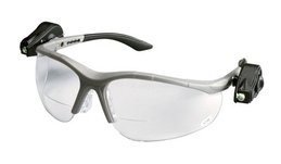 Clear anti-fog lens. Gray frame. Bifocal readers with +2.5 magnification diopter. Polycarbonate lens absorbs 99.9% UV. Includes LED lights, microfiber bag and lanyard. Meets the requirements of CSA Z94.3-2007 and the High Impact Requirements of ANSI Z87.1-2003. 10 safety glasses per case.