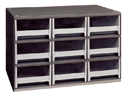 - Steel Small Parts Storage Cabinet with 9 Drawers. Store, consolidate and organize small parts. Two cabinets fit side by side on standard 36" wide shelving. Drawers are removable and are rust, corrosion and dent proof. No sharp edges to damage parts. Unique rear stop tab on each drawer prevents spills. Two dividers and one label are provided with each drawer. Additional dividers and replacement drawers can be purchased separately. Heavy-duty welded-steel frame and charcoal gray baked-enamel chip-proof finish. Strong high-impact polystyrene drawers. Molded-in label holder and transparent window allow instant content identification. Drawer Dimensions: 5 3/16"W X 3 1/16"H X 10 9/16"D.