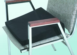- Ergo Cush. Unlike most standard seats which slope backward, the Ergo Cush slopes forward, automatically positioning the body to maintain the natural "S" shape of the spine in the lumbar region. Pressure is evenly distributed along the back instead of being concentrated at the base of the spine. The Ergo Cush helps alleviate persistent back discomfort and helps prevent back problems. Upholstered in black velveteen. Convenient 6 1/2" carry handle. 15"W x 15"D x 1 1/2"H (front), 3 1/2"H (back).