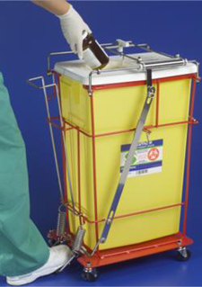 - Cart for a large volume Sharps containers. Floor bracket with wheels for the 8, 12 and 18 gallon large volume and Chemosafety containers. One-handed disposal. Lids may remain closed when not in use to reduce exposure to contents. Ergonomic handle is telescopic when transporting and retractable when stationary. Heavy containers can be removed from the side with minimal lifting. 22"H x12.75"D x22.5"W. 1/cs.