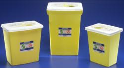 Chemosafety Sharps Container, 18 gallon, yellow with sliding lid. For the disposal of chemotherapy waste. Chemosafety containers accomodate different sizes of waste materials and sharps, including syringes, ampules, and prep materials.