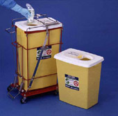 - Chemosafety 8 gallon yellow w/ Sliding Lid Sharps Container, 17.75"H x 11"D x 15.5"W. Sealing gasketed lids provide leak resistant containment of fluids. Absorbent pad inside of container helps absorb excess liquid inside of container. Adjustable sliding lid reduces the possibility of aerosolization and accommodates chemotherapy waste of various types and sizes. Available carts with wheels and built-in carrying handles for easy transport and lifting of heavy, full containers. Containers provide temporary and final locking closure for disposal. Nestable containers save valuable storage space.