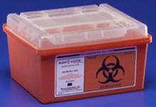 - 2 gallon Sharps Containers, red with clear lid. Clear, locking tops with horizontal load openings. Large horizontal openings accommodate larger syringes. Easy, simple assembly. Containers lock for final disposal. Nestable containers save valuable storage space. Full range of brackets. Plastics and pigments are safe to autoclave or incinerate.