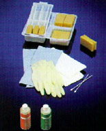 - Curity Wet Skin Scrub Trays, Sterile. Wrapped latex gloves (2), small winged-grip sponges (6), CSR wrap, 3-compartment tray, removable 2-compartment tray, cotton-tipped applicators (2), white absorbent towels (2), blue blotting towels (2), sponge sticks (3), 3.7 ounce bottle of Povidone-Iodine scrub solution (1), 3 ounce bottle of Povidone-Iodine paint solution (1). 3.7 ounce bottle of Povidone-Iodine scrub solution (0.75% available Iodine); and 3-ounce bottle of Povidone-Iodine paint solution (1.0% available Iodine). Compartmentalized tray offers greater flexibility of procedure.
