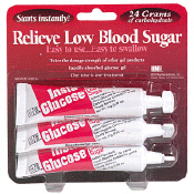 - Insta-Glucose, Glucose Gel For Low Blood Sugar. Starts instantly. 24 grams of Carbohydrate. Relieve Low Blood Sugar. Easy to use, easy to swallow. Twice the dosage strength of other gel products. Rapidly absorbed glucose gel. One tube is one treatment. Respond to insulin reaction quickly and conveniently. Fast-absorbing gel begins to work after swallowing. Premeasured dose reliably provides 24 grams of carbohydrate (96 calories). Tri-Pak convenience lets you keep the single-dose tubes in up to three locations, such as in the car, at work, or at school. Active Ingredients: Liquid Glucose NF 30 g.