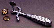 Finger Ring Cutter. Chrome handle. Safety lever slides protective plate between finger and ring. Large thumb screw operates a razor sharp serrated saw.