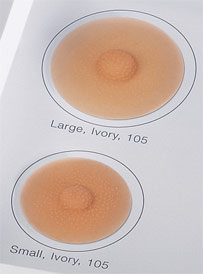 - Adhesive Nipples. Size: Small (1 1/2" diameter). Color: Ivory. Easily attached to any silicone breast form or to the skin, these nipples come in pairs. May be used on surgically reconstructed breasts and attached with roll-on adhesive. Includes one 30 mL bottle of Amoena Soft Cleanser.