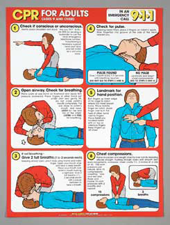 CPR For Adults Chart. Step-by-step guide shows the emergency techniques of adult CPR for ages 9 and over. Laminated for durability. Size: 18" x 24".