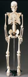 - Mr. Thrifty Skeleton. An economical teaching skeleton with a user-friendly personality that will encourage children to learn the names of the bones, and with enough details to satisfy students, doctors or anyone interested in the human skeleton. Key card and a heavy metal stand included. Has a removable calvarium. Size: 33-1/2" tall.