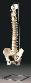 Model Vertebral Male Column without a stand. Flexible spine, with pelvis, occipital bone, vertebral artery and dorsal herniated disc between the 3rd and 4th lumbar veretrae. Size: 29" tall.