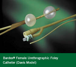 - Diagnostic Foley Catheter, Bardex Lubricath Female Urethrographic Latex Foley Catheter (Davis Model). 14 Fr. Short round tip. Drainage eye: single between balloons. 1 each. The double-balloon design aids in diagnosing urethral diverticula. Diverticula can fill during urination and lead to infection. The sliding meatal balloon accommodates any female urethral length. A single eye is located below the bladder balloon and above the meatal balloon. A 30 cc Bardex balloon is used in the bladder. A cone-shaped 20 cc meatal balloon provides an effective seal for the meatus to contain the contrast material. Radiopaque contrast media is introduced into the central lumen of the catheter to visualize the false passages of the urethra.