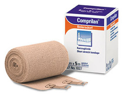 - Comprilan short stretch bandage, works on the principle of applying a low amount of pressure when the muscle is resting / not active. When the muscle is active, such as the calf muscle when walking, the short stretch bandage applies resistance to the muscle, also known as working pressure. The resistance or working pressure applied by a Comprilan short stretch bandage occurs because of the bandages limited stretch characteristic. Comprilan can only stretch to 90% or less than 1 times its length. This is the opposite of a high stretch bandage which can stretch up to 3 times its length when extended. The short stretch characteristic allows for Comprilan to be worn during rest and activities. Feature and Benefits: The interlocking weave provides the short stretch characteristic to help ensure consistent compression. Anatomically conforming allowing freedom of movement. Easy-care and durable, Comprilan can be washed and reused. 100% cotton bandage is comfortable to the skin. Available in 6, 8, 10, and 12 cm widths.