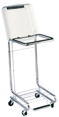 - Tilt-Top Square Hamper. Gray epoxy coated steel lid. Open design for easy unloading and minimal lifting. Steel prop for keeping lid open. Built-in bag holder. Heavy-duty bag support. 3" locking rubber wheel ball bearing casters. Durable chrome plated steel frame. 18.625"W X 19.5"D X 37.75"H (including casters). Weight 23 lbs. Step-on pedal for hands free use. Bags: 18"D, 36-42 gallons, disposable and reusable. Some assembly required.
