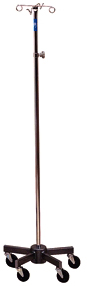 - IV/Infusion pump stand, heavy duty. Designed for strength and stability, these premium quality stands support IV equipment and infusion pumps with ease. This is a short wheel base -4 Ram's Horn hook model. Heavy center weight affords stability without taking up much space (16" diameter). 3" rubber wheel, ball bearing casters. Tough five-leg epoxy coated steel base. Chrome plated top post assembly and has an exclusive "no loss" knob.