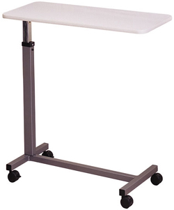 - The Brewer over bed table is both sturdy and reliable. This model features a gray laminate top with vinyl trim, and a durable gray epoxy finish on the base. Has spring loaded height adjustment, four point H-base with two locking dual wheel nylon casters. Adjustable height of 28"-43". The top measures 15"x30", and has a weight capacity of 50 lbs.