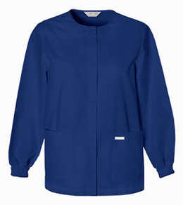 Ladies Jewel Neck Warm-Up Jacket. Size: 4X. Color: Navy. Jewel neck, 30" warm-up with patch pockets, snap front and rib knit cuffs. Poly/Cotton.