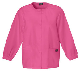- Ladies Jewel Neck Warm-Up Jacket. Size: Large. Color: Shocking Pink. Jewel neck snap front warm-up with two patch pockets and a cell phone pocket. Knit cuffs. Center back length 27.75". Poly/Cotton.