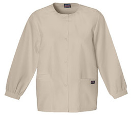 Ladies Jewel Neck Warm-Up Jacket. Size: Small. Color: Khaki. Jewel neck snap front warm-up with two patch pockets and a cell phone pocket. Knit cuffs. Center back length 27.75". Poly/Cotton.