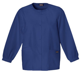 Ladies Jewel Neck Warm-Up Jacket. Size: Small. Color: Navy. Jewel neck snap front warm-up with two patch pockets and a cell phone pocket. Knit cuffs. Center back length 27.75". Poly/Cotton.
