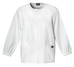 Ladies Jewel Neck Warm-Up Jacket. Size: Small. Color: White. Jewel neck snap front warm-up with two patch pockets and a cell phone pocket. Knit cuffs. Center back length 27.75". Poly/Cotton.