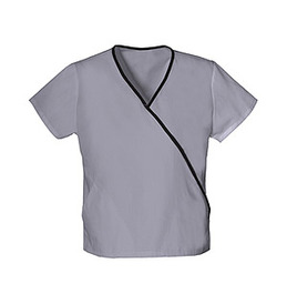 Ladies Mini Mock Wrap Top. Size: Large. Color: Grey. Mini mock wrap top with contrast binding. Two side angled hidden pockets. Center back length: 23.5". Poly/Cotton with soil release.