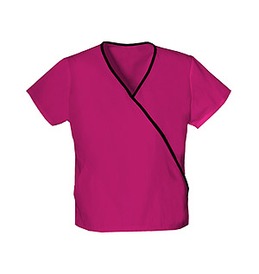 Ladies Mini Mock Wrap Top. Size: XS. Color: Raspberry. Mini mock wrap top with contrast binding. Two side angled hidden pockets. Center back length: 23.5". Poly/Cotton with soil release.