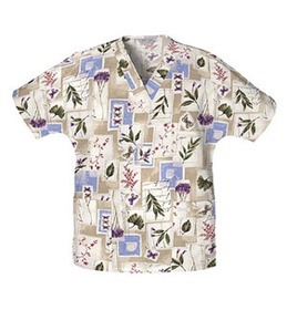 Ladies V-Neck Tunic. Size: Medium. Print: Ferndale. Dolman sleeve, v-neck tunic with side seam vents and patch pockets. Center back length: 28".