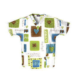 - Ladies V-Neck Tunic. Size: XL. Print: Victorian Hearts. Dolman sleeve, v-neck tunic with side seam vents, two patch pockets and a cell phone pocket. Center back length: 26.25". Poly/Cotton.