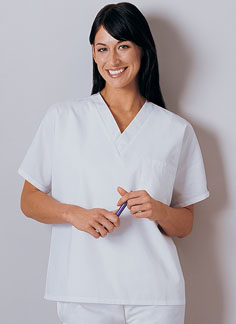 Unisex V-Neck Tunic. Size: 2X. Color: White. Dolman sleeve, v-neck unisex top has a chest pocket with a pencil slot and a stethoscope loop. Center back length: 27.5".
