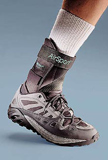 - AirSport Ankle Brace, Small, Right. The AirSport Ankle Brace incorporates clinically proven Air-Stirrup Ankle Brace features, such as a semi-rigid shell and aircells, to provide comfort and support. Additional compression and stabilization is provided by ATF (anterior talofibular) cross strap and integral forefoot and shin wraps. The unique "step-in" design (toes first inserted into the back of the brace) and automatic heel adjustment make the AirSport extremely fast and easy to put on, just: Step In, Strap Up, And Go! Foam-filled aircell that cushions and supports the ankle. Coated fabric for durability.