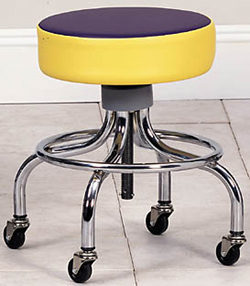 - Chrome Base Stool with Multi-Color Top. Smooth machine screw height adjustment. Solid steel machine screw shaft (not hollow pipe). Round foot ring. 1" welded tubular frame. Stool frame is completely chrome plated (including welds). Heavy-duty seat mounting plate 1/4" x 6" x 6". 2" rubber casters. 14" diameter seat. 4" thick padded seat for comfort. Easy clean upholstery with Perma-Block-3 stain resistant topcoat. Two-tone upholstered top. Contemporary Styling. "Soft Feel" laminated polyfoam cushions. Durable construction. 20 colors of vinyl.