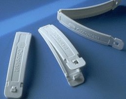 Simple-closure clamp for extra security with drainable pouches is especially helpful for those with limited dexterity.