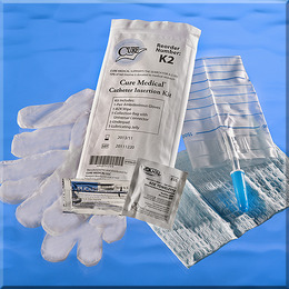 The Cure® catheter insertion kit includes a nonstaining BZK wipe, one packet of lubricating jelly, one pair of ambidextrous gloves, a collection bag (with or without a universal connector), and an underpad. Available as a case of 100 units.