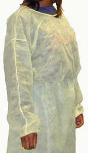 - Disposable Isolation Gown. This gown is made from 30 gram spun bond polypropylene and is fluid resistant. The gown has an elastic cuff for a secure fit. Full sizing - the extra length ties allow fitting from small to extra large. The ties are sewn into the neckline and waist so that they are never lost. Packed 10 per poly bag for convenient storage on carts. This product contains no latex. Color - Yellow.