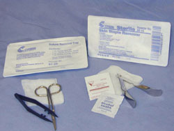 • Pre-assembled sterile tray with a variety of components. Packaged 50/cs. Metal littauer scissor, metal suture forceps, 3"x3" gauze.