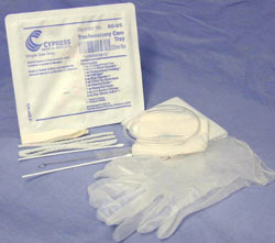 - 3-Compartment tracheostomy tray. Packaged 20/cs. Tray includes: Tracheostomy Dressing, Waterproof Drape, (1 pair) powdered and cuffed Vinyl Gloves, (4) 4 in. x 4 in. gauze sponges, Twill Tape, (4) Pipe Cleaners, (2) Cotton-Tip Applicators, 14 mm Cleaning Brush.