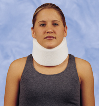 - DeRoyal Comfo-Eze Foam Cervical Collar (1002-xx series) are narrow in height (from top/chin to bottom/chest). This collar fits around the neck, resting on the shoulders and supporting the cervical spine in way that gives both mandibular (joint that hinges the lower jaw ) and occipital (bone that forms the lower posterior part of the skull) support. The foam is a medium density and is covered by a breathable synthetic stockinette. There is also an extra covering that can be removed and washed. The collar attaches by means of a velcro closure. The collars are available in 5 different sizes: X-Small through an X-Large. The X-Small is 19-1/2 inches wide by 3 inches in height; the Small is 20-1/2 inches wide by 3-1/2 inches in height; the Medium is 22-1/2 inches wide by 3-1/2 inches in height; the Large is 24-1/2 inches by 3-1/2 in height; and the X-Large is 25-1/2 inches wide by 3-1/2 inches in height.