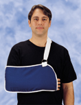 - Specialty Arm Sling, Infant, Print. Pouch size 5-1/2" x 11". Select Shoulder Pad with Navy Pouch. This heavy-duty arm sling features double D-rings with hook and loop closure and a thumb loop to prevent wrist drop. Special finish repels stains.