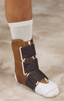 - Leatherette Ankle Splint. Indicated for mild to severe ankle sprains and strains. Greatly reduces the medial and lateral movements of the ankle. Special new design contours better over the ankle and heel area. Velcro adjustable closure. Perforated soft vinyl leatherette allows patient's skin to breathe. Color: brown. Size: large. Ankle circumference: 10" to 11-1/2".