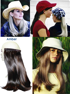 - Amber Hairpiece from Hat and Hair. Color: 4/6. Attaches to hat, not to your head. 15 in. wide - temple to temple. X-Long layered. 14 to 16 in. tapered ends. Amber is perhaps the most versatile hairpiece. It can be worn straight down, pulled up in a ponytail through the baseball cap, worn as braids... it's up to your creativity!