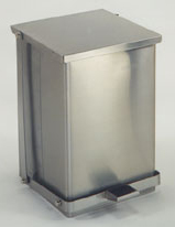 • Stainless Steel Step-On Can. Capacity: 24 quart (6 gallon). Feature unitized contruction, full-width hinges for long life, heavy-duty foot pedal and linkage system, self-closing lid and bag-security mechanism. Plastic protective molding hems bottom of epoxy polyester cans. "Bio-Hazard" and "Infectious Waste" adhesive-backed identifying labels included FREE. 16"H x 11.75"W x 13"D.