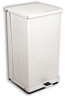 - White Baked Epoxy Steel Step-On Can, 24 quart (6 gallon), 16"H x 11.75"W x 13"D, 14 lb. Perfect for hospitals, doctors' offices, patients' rooms, and laboratory settings, Detecto Step-On Can Waste Receptacles have unitized construction and are built for durability. The cans are flame retardant, have a self-closing lid for sanitation, epoxy polyster finish for easy cleaning, and full width hinges for long-term use. An optional handle and wheel kit is easy to install and makes the larger cans easy to move. Detecto also includes free bio-hazard and infectious waste adhesive labels to meet OSHA labelling requirements. Economic, epoxy cans are easily cleaned. Heavy-duty foot pedal and linkage. Hemmed, exposed edges. Bag securing mechanism. Epoxy cans resist scratching and stains.