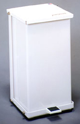 - White Baked Epoxy Steel Step-On Can, 32 quart (8 gallon), 21"H x 11.75"W x 13"D, 16 lb. Perfect for hospitals, doctors' offices, patients' rooms, and laboratory settings, Detecto Step-On Can Waste Receptacles have unitized construction and are built for durability. The cans are flame retardant, have a self-closing lid for sanitation, epoxy polyster finish for easy cleaning, and full width hinges for long-term use. An optional handle and wheel kit is easy to install and makes the larger cans easy to move. Detecto also includes free bio-hazard and infectious waste adhesive labels to meet OSHA labelling requirements. Economic, epoxy cans are easily cleaned. Heavy-duty foot pedal and linkage. Hemmed, exposed edges. Bag securing mechanism. Epoxy cans resist scratching and stains.