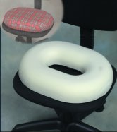 Molded foam ring cushion, made of one-piece, puncture-proof molded foam, ring shape comfortably to body contours, removable polyester/cotton cover is washable.