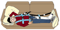 - E-Z-ON MODIFIED VEST (model number 101M2), transport children in a prone or supine position. Dynamically tested and meets FMVSS213. It features shoulder adjusters that enable the vest to "grow" with the child or adjust for seasonal clothing, and crotch straps that keep the lower hip strap of the vest positioned over the hip. Transport children in a prone or supine position securely. Certain physical disabilities (such as spinal injury, body cast, long leg cast or hip spica) require a child to lie down when riding in a vehicle. The Modified Vest enables these children to be transported safely and securely. Now a child can nap comfortably in the car, and parents can have peace of mind knowing that their child is still secured to the vehicle's seat belt. Uses your vehicle's existing seat belts - no modification or locking clips are necessary. Just put the vest on the child (adjust it for a snug fit the first time you use it), lay the child on the seat, and secure the vehicle's existing seat belts after threading them through the sides of the vest and the leg belt. Place pillows as shown for comfort and protection in case of a collision.