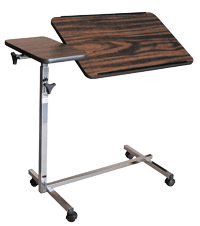 - Two Stage Tilt Top Over Bed Table. Chrome-plated base, wood grain top. Adjustable height from 27 to 42 in. Partial top stays flat as larger top tilts. Holds up to 10 pounds. Particle board tops. Four easy rolling 40mm casters provide smooth and stable mobility. Tilt function allows user to turn the table to preferred angle for reading.
