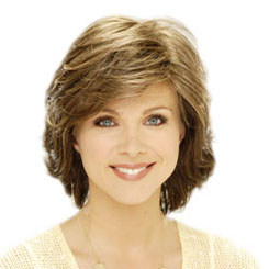 Natalie Wig by Estetica Designs. Color: R12/26H. Page style that just brushes the shoulder and flips in the back.