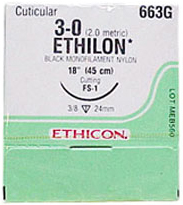 Black Monofilament Ethilon Pliab Suture. Reverse Cutting Needle. Ethicon Needle Type: FS-1. Needle Shape: 3/8 Circle. Needle Length: 24mm. Suture Length: 18". Suture Size: 3-0.