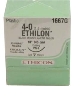 Ethilon Nylon Suture. Black monofilament. Non-absorbable. Precision point-Reverse cutting. Size: 4-0. Length: 18". Needle: PS-2, 3/8 circle.