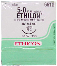 Black Monofilament Ethilon Pliab Suture. Reverse Cutting Needle. Ethicon Needle Type: FS-2. Needle Shape: 3/8 Circle. Needle Length: 19mm. Suture Length: 18". Suture Size: 5-0.